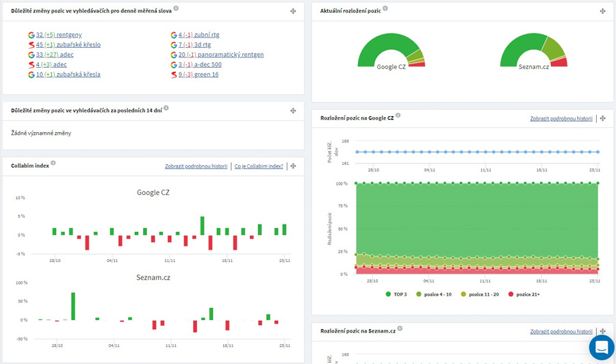 - Pozice ve fulltextovém vyhledávání sledujeme, ale to samo o sobě nestačí. Aktivně proto pracujeme s obsahem a strukturou klientova webu – aplikujeme poznatky ze SEO branže.