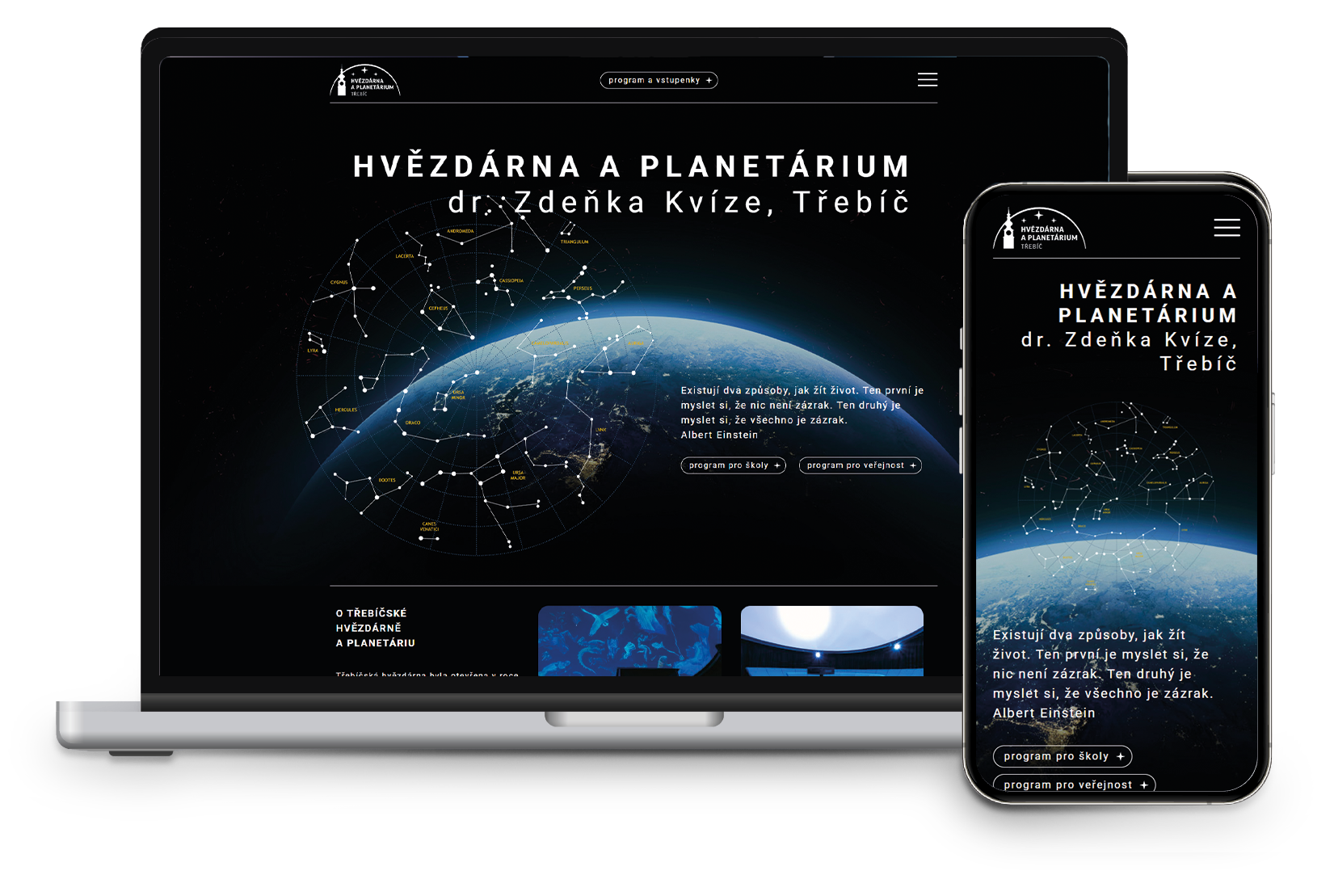 Web, který otevírá vesmír Hvězdárna a planetárium dr. Zdeňka Kvíze, Třebíč získala nový rozměr – vedle kopule s dalekohledy teď září i malé planetárium. A my jsme mu dali novou grafickou podobu včetně jeho digitální tváře, která přitáhne zájemce o astronomii i vzdělávání.